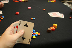 После этого сдается открытый флоп. Флоп – это первые три общие карты, доступные всем активным игрокам. Первым ходит активный игрок, сидящий по часовой стрелке от баттона. Все беты и рейзы делаются по малым ставкам (увеличение на $2 в игре $2/$4).